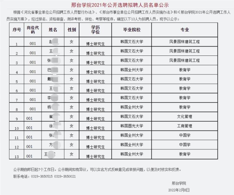 这则《邢台学院2021年公开选聘拟聘人员名单公示》,在邢台市人力资源和社会保障局官网上仍然能查到。公示中称,根据《河北省事业单位公开招聘工作人员暂行办法》《邢台市事业单位公开招聘工作人员实施办法》和《邢台学院2021年公开选聘工作人员实施方案》,经过报名、资格审查、测评考核、体检、考察等程序,确定13名拟聘人员。这13名博士研究生全部为女生,分别毕业于韩国又石大学、韩国全州大学和韩国圆光大学,其中1人为文化管理专业,1人为工商管理专业,2人为中国学专业,3人为风景园林建筑工程专业,6人为教育学专业。