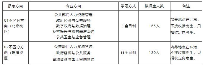 主要招生专业方向:公共部门人力资源管理、政府经济与公共服务、数字政府与数据治理、自然资源与国土空间管理、乡村振兴与农村基层治理、公共卫生与应急管理。