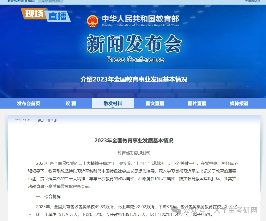 全年研究生教育招生135.7万人,在学研究生409.5万人,毕业生108.4万人。