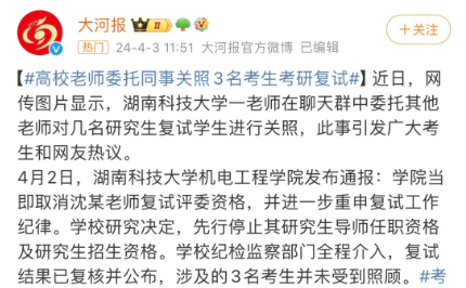 去年“湖南科技大学一位老师在聊天群里委托同事关照3位考生考研复试”,当时这件事情引起广泛关注。