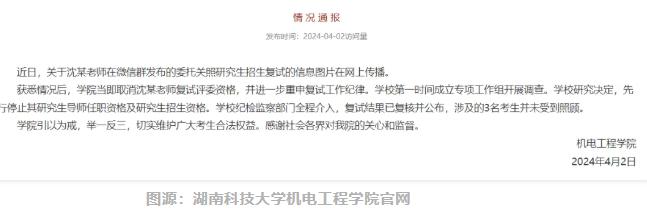 湖南科技大学对此事反应迅速,机电工程学院在获悉情况后,当即取消了沈某老师的复试评委资格,并进一步重申了复试工作纪律。