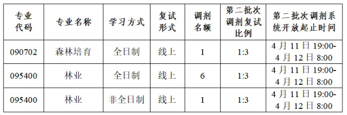 (3)095400林业(非全日制)。本专业接收调剂专业要求:0907林学所有专业、0901作物学所有专业、0902园艺学所有专业、0903农业资源与环境所有专业、0904植物保护所有专业、0909草学、0910水土保持与荒漠化防治学、0971环境科学与工程所有专业、0972食品科学与工程所有专业、095131农艺与种业、095132资源利用与植物保护、095135食品加工与安全、095136农业工程与信息技术、095400林业。0907林学所有专业优先,其次095400林业专业,最后其余专业,按分数从高到低排序。调剂考试科目要求:要求科目2为英语,英语(一)和英语(二)可视为相同。