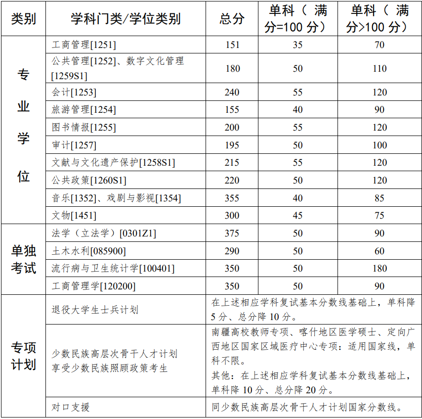 3. 少数民族高层次骨干人才计划、退役大学生士兵计划的分专业复试基本分数线 由分配到该专项招生计划的招生单位自主确定。