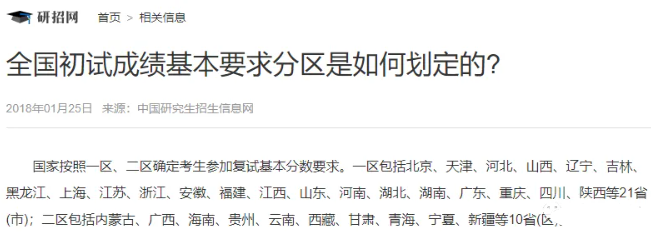 从中国研究生招生信息网发布的复试分数线也可以看出,教育部依据考生报考地的所处区域位置划分不同的复试分数线,这其中的划分区域就是我们常说的一区、二区。