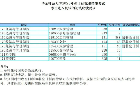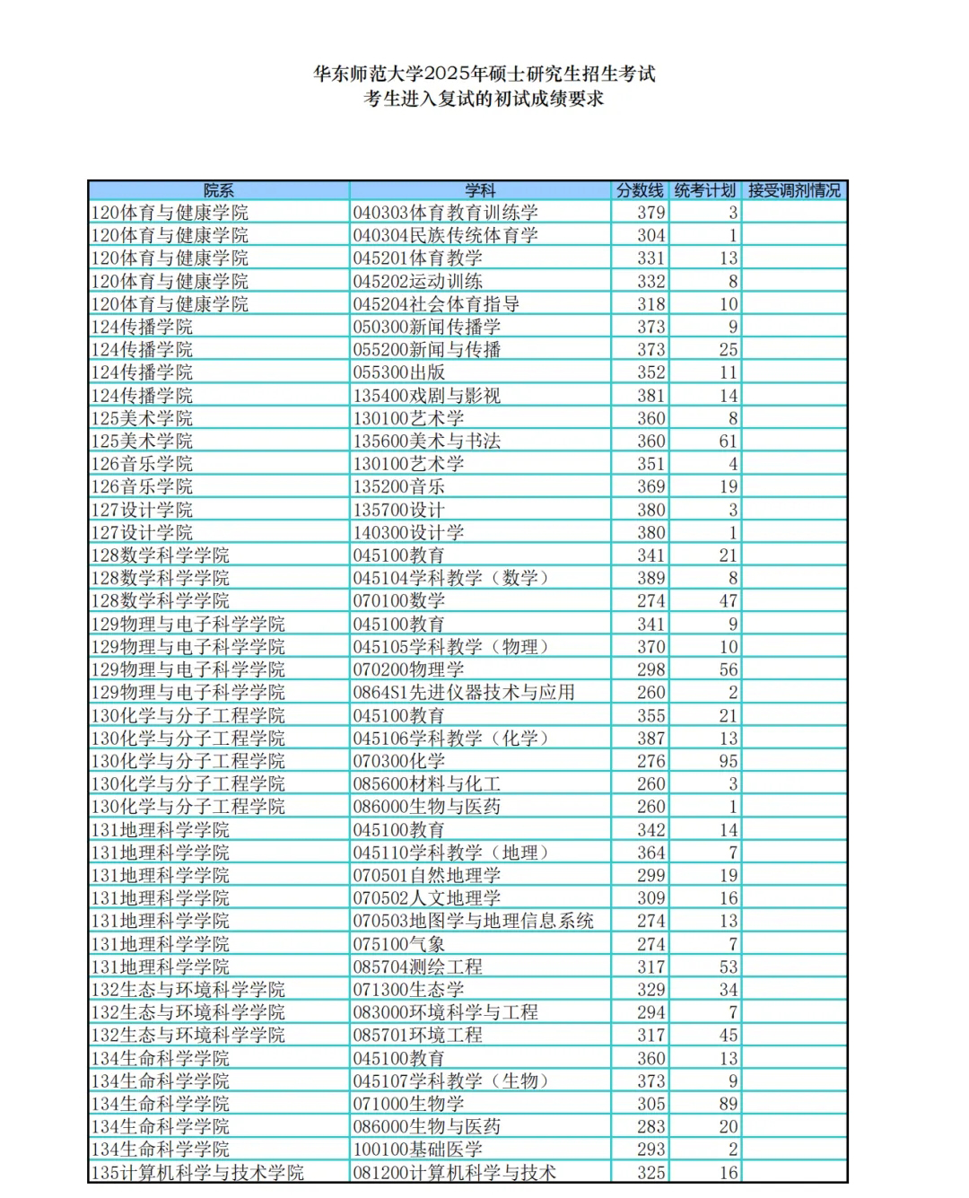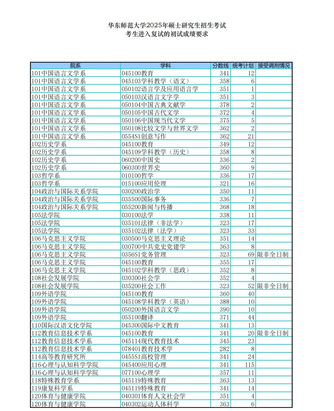 在教育部《2025年全国硕士研究生招生考试考生进入复试的初试成绩基本要求》(以下简称“国家分数线”)基础上,现公布华东师范大学2025年硕士研究生招生考试考生进入复试的初试成绩要求,即“学校分数线”。